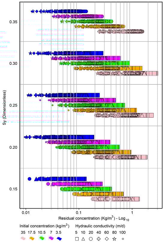 Residual concentration vs. specific yield, with initial concentration (color) and hydraulic conductivity (geometric shape) at the end of the peak efficiency period.