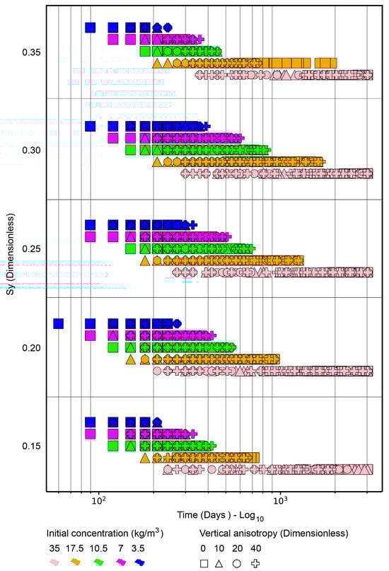 Time necessary to reach a residual concentration equal to 0.5 k/m3 vs. specific yield, with initial concentration (color) and vertical anisotropy (geometric shape).