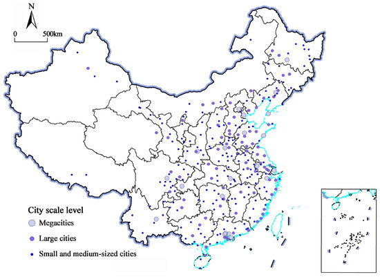 Given the availability and completeness of data, 288 cities in China (including municipalities and prefecture-level cities) were selected as research units, excluding Hong Kong, Macao, and Taiwan. Using the “urban district population” from the Seventh National Population Census, cities were categorized as follows: megacities (>10,000,000), megalopolises (5,000,000–10,000,000), large cities (1,000,000–5,000,000), medium-sized cities (500,000–1,000,000), and small cities (<500,000). The 288 cities were grouped into three categories: 21 megacities (>5,000,000), 80 large cities (1,000,000–5,000,000), and 187 small and medium-sized cities (<1,000,000), as illustrated in Figure 1.