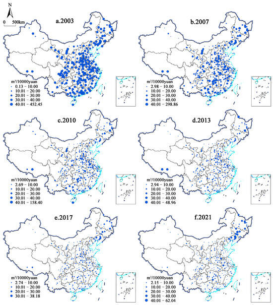 To reveal the spatiotemporal evolution of urban SDI in China from 2003 to 2021, we select urban SDI data from six sections (2003, 2007, 2010, 2013, 2017, and 2021, respectively) and use ArcGIS 10.7 for visualization. We classify the data into five classes using the Manual method, with thresholds set at 10, 20, 30, and 40 m3/million yuan, after which we sequentially define them as low, medium–low, medium, medium–high, and high-discharge classes. These are further plotted as the spatiotemporal pattern map of urban SDI.