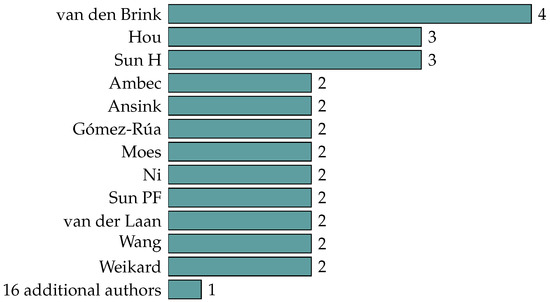 We initially categorised the selected papers according to the topics of sharing of water resources; cost sharing of infrastructure for water supply or disposal; and cost sharing of flood, flood prevention, pollution or pollution control. We also reviewed the papers to determine whether they aim for a fair distribution of collective benefits or costs. Furthermore, we evaluated the areas in which they made substantial contributions, and we list the game-theoretic concepts they used (methods outside of game theory are also summarised under “others”). Many papers have a purely application-oriented approach to a real-world problem. The technical contribution then consists in constructing a framework for applying existing game-theoretic methods (these are marked with ∗ in Table A1). Further, almost two-thirds of the articles () contain a real-world application, a significant proportion of which () describe transboundary watercourses. Figure 2 shows that most of the empirical studies in the sample focus on rivers in the countries of Turkey, Syria, Iraq, China, USA, Iran, Sudan, Pakistan, Ethiopia and Egypt. The description/analysis of all these papers is beyond the scope of this work; rather, this preliminary selection is intended to illustrate the interdisciplinary interest and importance of the topic. The academic interest in the topic has increased significantly over time, especially since around 2010. A list and classification of the papers can be found in the appendix (cf. Table A1). Here we focus on the axiomatic approaches that relate almost exclusively to river sharing problems. Seventeen papers remain, with van den Brink contributing the most publications (n = 4, cf. Figure 3). These articles have different objectives and use various principles in the context of the river sharing problem; therefore, they will be described in the next section. We then analyse their games and solutions and situate them within the context of real-world applications.