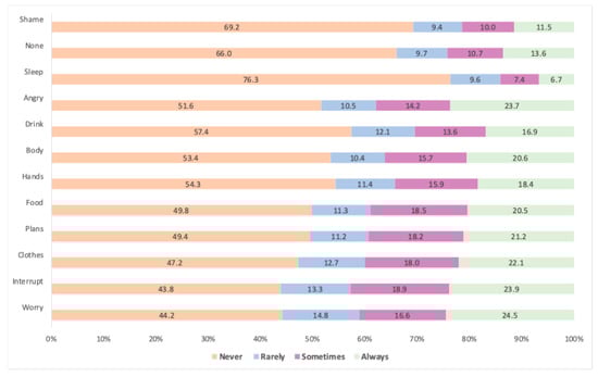| Note: Adapted from Young et al. [1]. The responses to items are: never (0 times), rarely (1–2 times), sometimes (3–10 times), often (11–20 times), always (more than 20 times), do not know, and not applicable/I do not have this. Never is scored as 0, rarely is scored as 1, sometimes is scored as 2, and often/always are scored as 3. | |