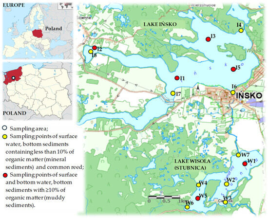 Lakes Ińsko and Wisola (Stubnica) are located in the West Pomerania Lake Region, northwestern Poland (Figure 1), within the Ińsko Landscape Park and the Ostoja Ińska special bird protection area of the Natura 2000 program (PLB320008), with these being areas of particular importance for the preservation of biodiversity. Natura 2000 areas include the most valuable and endangered species and habitats in Europe. Over 140 species of birds nest in Ostoja Ińska, including at least 29 species from Annex I of Council Directive 79/409/EEC and 7 species from the Polish Red Data Book. Lake Ińsko has a catchment area of 5.20 km2 and Lake Wisola of 1.73 km2 [35]. Lake Ińsko has been characterized by a moderate susceptibility to deterioration and class II water purity [36]. The lake has been classified as eutrophic, which was certainly influenced by the inflow of untreated municipal sewage from the town of Ińsko [37]. Lake Ińsko has been described as an α-mesotrophic subtype (oxygen saturation > 20%) [35].