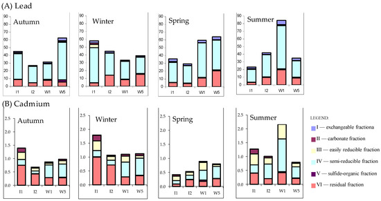 The opposite was the case with Cd, where in both lakes, a significant share was found in the carbonate fraction (II) and the lowest in the exchangeable (I) and organic sulfide (V) fractions. Moreover, in bottom sediments from Lake Ińsko, Cd was usually associated with the residual fraction (21–67%), followed by the easily and medium-reducible fractions (IV) depending on the season and sampling site (Figure 2).
