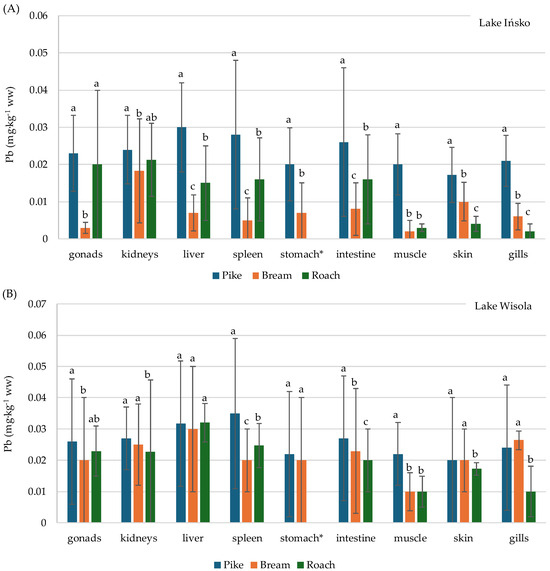 For the analysis of Pb and Cd, the fish were thawed, and the body cavity was opened with a stainless-steel knife. The sex was determined based on the gonads, and the following materials were collected for testing: muscles from the dorsal part, skin, gonads, kidneys, liver, spleen, gill lobes, digestive tract and digestive content. In pike, the digestive tract was divided between stomach and intestines, while in bream, into anterior and posterior parts. Fish organs and tissues were stored (−20 °C) in PE bags until analysis.