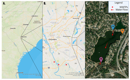 Three-panel geographic overview of Lake Katherine sampling sites and hydrological context. (A) Regional map showing the location of Columbia, South Carolina, USA. (B) City-scale map of the Columbia metropolitan area, highlighting the Forest Acres neighborhood where Lake Katherine is situated. Red stars mark the locations of nearby wastewater treatment plants (WWTPs), which are downstream of Lake Katherine. (C) High-resolution satellite image of Lake Katherine with three surface water sampling sites marked. Site 1 (blue, 34.007569, −80.961264) represents the inlet, where a tributary enters the lake. Site 2 (orange, 34.005997, −80.958055) is located in a low-circulation cove within the lake. Site 3 (purple, 33.997428, −80.965949) is the outlet, where water exits the system. Red arrows indicate the general direction of surface water flow through the lake. Figure created using ArcGIS Pro v3.1.3 by Esri.