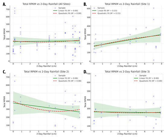 Scatter plots of total ARG abundance (Total RPKM) versus two-day rainfall: (A) Regression and scatter data for all sites combined; (B) Regression and scatter data for Site 1; (C) Regression and scatter data for Site 2; (D) Regression and scatter data for Site 3. Blue points represent individual samples. Green lines indicate linear regression fits, and red dashed lines show quadratic fits. 95% confidence intervals for linear regression line represented by green shaded area. R2 values are displayed for each model. Only the linear model for Site 1 showed a statistically significant relationship.