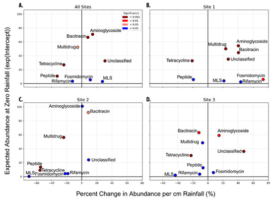 Site-specific associations between rainfall and ARG class abundance in Lake Katherine. Rainfall-associated changes in ARG-class abundance: (A) average trends for the lake across all sites; (B) Site 1; (C) Site 2; (D) Site 3. All figures share an x axis and a y axis for comparability. X axis is the expected percent change in the ARG class per cm of rain in the 2 days leading up to the sampling date. Y axis is the baseline RPKM for the ARG class at 0 cm of rainfall in the two days leading up to the sampling. Significance is based on the X axis, because the primary focus is on whether rainfall has a significant impact on the ARG classes listed. Significance: Brown (<0.001), Red (<0.01), Pink (<0.05), Blue (>0.05). Figure data can be found in Supplementary Table S4.