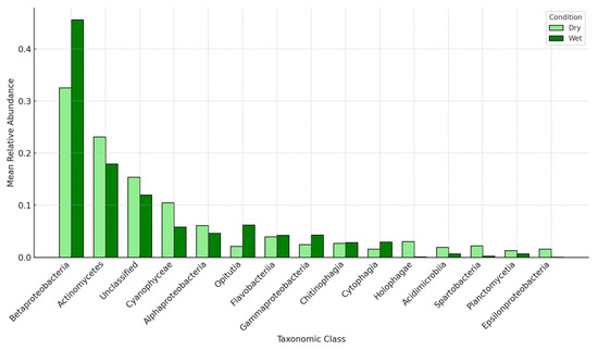 Mean relative abundance bar chart of the top fifteen ARG-carrying taxonomic classes under dry (<1 cm two-day rainfall) and wet (≥1 cm) conditions. For each sample, the number of ARG-bearing contigs per class was divided by the total ARG-containing contigs to yield a relative abundance; these values were then averaged across all dry or wet samples. Bars are shown in light green (Dry) and dark green (Wet) with black outlines. Taxa are ordered by their overall mean abundance across both conditions; error bars denote the standard error of the mean. The top 15 results are shown in the figure.