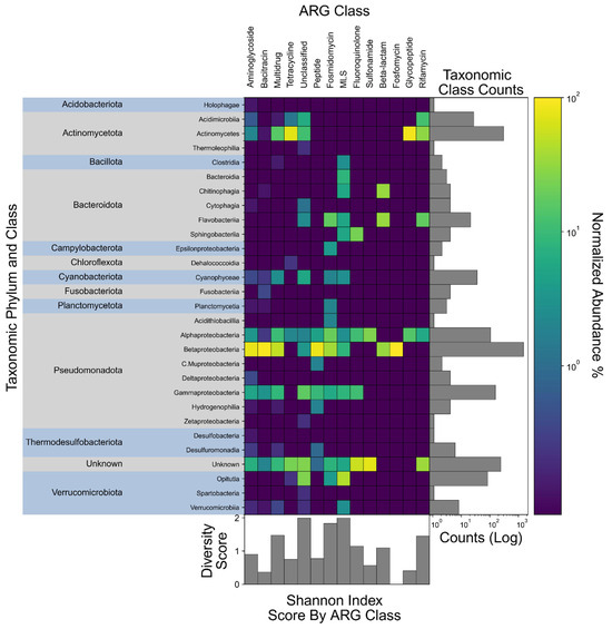 Taxonomic composition proportion heatmap of ARG-associated microorganisms across all samples. The heatmap is 100% normalized for each ARG class to better show relative composition similarity. To the left of the heatmap are the taxonomic classes organized by phylum. Along the top axis are ARG classes clustered based on similarity. To the immediate right of the heatmap is a horizontal bar graph showing the raw counts of each taxonomic class, providing context on their absolute abundance. Along the bottom is a bar graph containing the Shannon diversity indices, representing the composite richness and evenness of taxonomic compositions corresponding to each ARG class along the top.