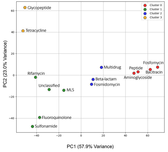 To further clarify taxonomic relationships between ARG classes, principal component analysis (PCA) was conducted on the overall taxonomic composition of each ARG class, and a k-means clustering of k = 4, as determined by elbow curve calculation, was used to group the points (Figure 7). Glycopeptide and Tetracycline (yellow) plotted near the upper left quadrant, indicating a distinct taxonomic composition compared to most other ARG classes. Specifically, as mentioned previously, these two classes largely occupy Actinomycetes (Figure 7). In contrast, classes such as Fosmidomycin, Beta-lactam, and Multidrug genes (blue) clustered near the center of the PCA plot, suggesting these ARG classes have microbial compositions that are more intermediate or mixed, without strong associations to specific taxa prevailing over either principal component. Fosfomycin, Bacitracin, Peptide, and Aminoglycoside gene classes (red) formed a loose cluster on the right, reflecting a shared community composition that differs from the other classes. Particularly, these four classes display high levels of association with betaproteobacteria (Figure 6), which is influencing their distribution across Principal Component 1 (PC1). These observations align with the earlier findings that certain proteobacterial lineages and other taxa are more frequently associated with specific ARG-classes. From a broader ecological perspective, these clusters may indicate that specific ARG classes are enriched by similar environmental niches or selective pressures. The high percentage of variance captured by the first two components suggests that taxonomic composition is a major driver in differentiating ARG classes.