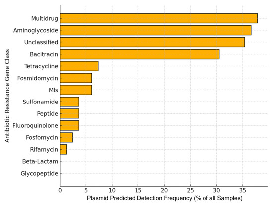 Each of the 82 sample files was scored as present (1) or absent (0) for each ARG class based on whether at least one plasmid predicted contig was detected for the ARG class in question. This binomial representation allowed for comparison across samples without being confounded by contig length or assembly completeness. The most frequently detected plasmid-associated ARG classes were Multidrug resistance (36.9% of samples), Aminoglycoside (35.7%), Unclassified (34.5%), and Bacitracin (29.8%) (Figure 8). One-tailed Fisher’s exact tests with Benjamini–Hochberg correction revealed that these four classes were significantly enriched on plasmids relative to all other ARG classes (adjusted p < 0.001) [Supplementary Table S7]. The marked enrichment of these classes, particularly the large proportion of unclassified ARGs, highlights a substantial, yet poorly characterized, pool of mobile resistance elements.