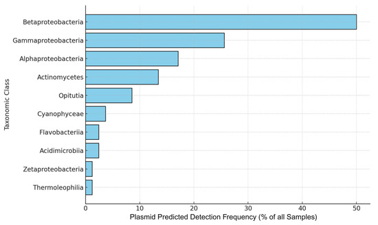 Detection frequency of taxonomic classes in plasmid-predicted samples. Horizontal bars indicate the percentage of 82 metagenomic samples containing at least one plasmid-associated contig assigned to the indicated taxonomic class (binary presence/absence). Betaproteobacteria, Gammaproteobacteria, and Alphaproteobacteria are significantly enriched on plasmids (Fisher’s exact test, BH-adjusted p < 0.001). While plasmid association provides useful context for ARG mobility, these predictions are not experimentally validated and should be interpreted as probabilistic, not definitive.