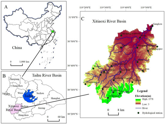 (A) the map of China; (B) location map of Taihu River Basin; (C) location map of the Xitiaoxi River Basin. Note: The elevation is extracted from DEM, which is derived from the Geospatial Data Cloud.