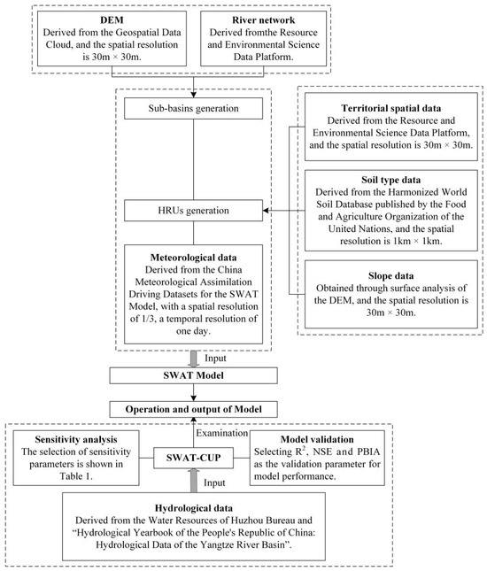 The SWAT model is a typical distributed watershed hydrological model developed by Dr. Jeff Amold based on the GIS platform for the United States Department of Agriculture (USDA). The model has a powerful physical mechanism and is mainly used to evaluate the impact of land use management on sediment production, pollutant migration, and watershed hydrological processes. The model comprehensively considers natural and social factors and can simulate long-term surface runoff in the watershed. The SWAT model mainly consists of the following steps. Firstly, this article divided the sub-basins by loading the DEM and river network. Secondly, hydrological response units (HRUs) were divided by adding land use, soil, and slope. HRU is a computational subunit characterized by unique soil, territorial spatial, and slope combinations, representing areas with similar hydrologic behavior. Its fundamental premise is that uniform territorial spatial type, soil type, and slope characteristics within a given HRU result in consistent hydrologic responses [34,35]. Thirdly, meteorological elements were loaded after dividing the HRUs. Thirdly, we created model input files, built the model database, ran the model, and output the results. Finally, based on SWAT-CUP tool, hydrological data was used to conduct sensitivity analysis and validation of simulation results. The specific process is shown in Figure 2.