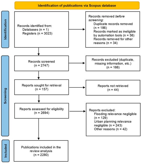 A literature review on the subject was conducted in January 2025 using the Scopus database. The search formula used the terms “urban planning” AND “flood”, with the search executed across titles, abstracts, and keywords. A total of 2694 documents were retrieved, dating from 1970, most of which were journal articles. This sample was the result of cleaning a previous sample of more than 3000 documents, after subjecting the initial sample to a pre-screening operation. In this initial operation, publications of journals that had nothing to do with the area of knowledge addressed or whose inclusion was the result of the partial conjunction of the random appearance in the title, abstract or keywords of these words in contexts unrelated to the researched one were discarded (this part was performed manually, looking mainly for anomalous results from journals and serial publications that did not usually deal with the subject studied).