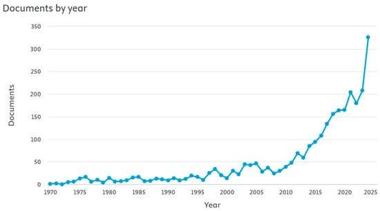 Number of documents published annually from 1970 to December 2024. Source: Scopus database. Search for “urban planning” AND “flood”, executed in title, abstract and keywords. A total of 2694 documents were obtained.
