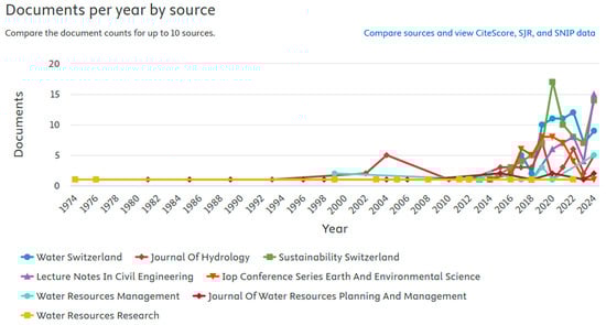 Similarly, from 2010 (this date is not an exact point of change in inertia but rather the approximate beginning of the current phase of sustained growth; Figure 4), articles started appearing primarily in journals focused on sustainability, environmental issues, or urban planning, such as Sustainability, Water, Landscape and Urban Planning, and IOP Conference Series: Earth and Environmental Science. Before that time, the primary sources were journals such as the Journal of Hydrology, Water Resources Management, the ASCE Journal of Water Resources Planning & Management and Water Resources Research, indicating a more hydraulic and hydrological focus in earlier publications (see in Figure 4 the historical evolution of this type of publication on the eight journals that have the largest number of articles on the subject).