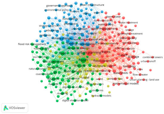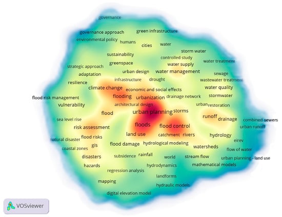 Nevertheless, the more interesting thing about these figures is not simply about corroborating the current positive bibliometric relationship between urban planning and flooding but being able to analyze the spatial distribution of the ecosystem of concepts that exists in this topic, characterizing their levels of intensity. It is particularly noteworthy that topics in the blue cluster related to climate change—such as integrated flood management, risk evaluation, adaptation strategies, resilience and sustainability, nature-based solutions, and environmental policies—carry significant weight in publications discussing the relationship between flooding and urban planning (Figure 4). However, as seen in Figure 5, these topics have only recently begun to receive attention (yellow and light green nodes), which is in contrast to earlier studies that focused on watershed-related aspects, hydrology, hydraulic and hydrological modeling, runoff, or drainage (dark green and red nodes).