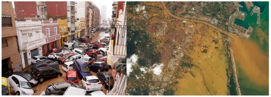 However, in many developing countries in Asia, Africa and Latin America, which are currently some of those in which the highest rate of accelerated urbanization is taking place on the planet, this debate is not even on the table, given that the country’s socioeconomic priorities are other more pressing. Even in the developed countries themselves, debates on this issue take place in crisis situations that do not lead to prioritizing scientific knowledge in this area over economic needs (see, for example, what happened recently in Spain, where after heavy flooding in various peripheral towns in the south of the metropolitan area of the city of Valencia, that ended the lives of more than 220 people who lived in areas declared floodable almost 20 years ago [139] but built some decades earlier, the administrations finally decided to repair and rebuild in the same areas in view of the economic difficulties of relocating the homes of all these populations to other safer areas and the social urgency to relocate those affected by the catastrophe; Figure 8).