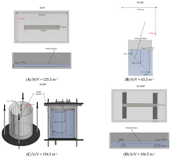 Top and side views of test setups. Illustrations of the utilized setups are provided, displaying the dimensions and the height of the used setup (hliquid) once filled and prepared for testing. For clarity, the illustrations are depicted with only one coupon, while during the experiments, six coupons made of the same material were placed in each setup. (A) 0°, (B) 45°, (C) 90°, (D) 180°.