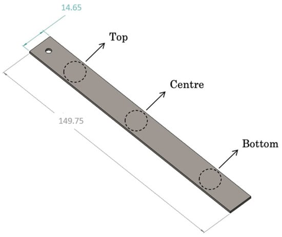 For each tested coupon, three designated areas along the coupon’s length were selected to gain a comprehensive understanding of the combined effects of gravitational force and bacterial motility. In each area, at least 3–5 measurements were conducted. These three positions were strategically chosen: one at the top edge of the coupon, symbolized as “Top”; another in the middle of the coupon, referred to as “Centre”; and the third at the bottom edge of the coupon, denoted as “Bottom”. The nomenclature of these regions applies to inclined coupons and is depicted in Figure 3.
