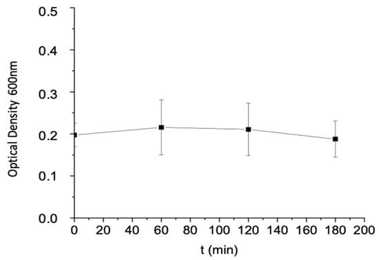 At the beginning and the end of each experiment, the OD of the culture mixture was measured. The results showed that the values of the OD are similar in all experiments, with minimal variation observed between replicates. For this reason, the results are presented in a single consolidated diagram derived from all experiments conducted within a specified time frame. As shown in Figure 4, the OD values exhibit negligible deviations over time, and the average values remain essentially constant throughout the 3 h incubation period.