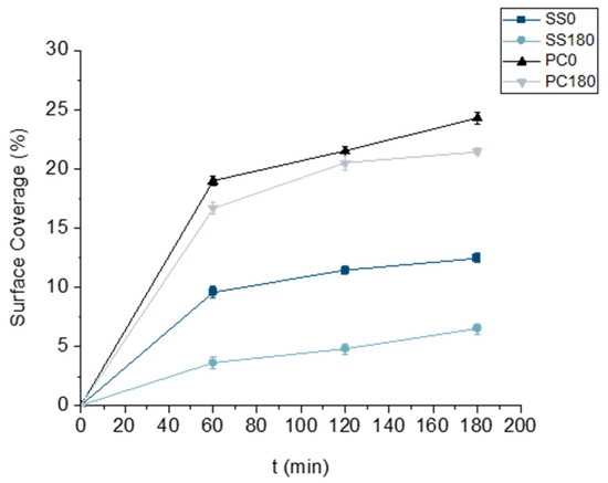 Furthermore, a higher percentage of surface coverage was observed for the PC surface for all control points compared to the SS ones (Figure 8). These results are consistent with those obtained at θ = 0° and 180°. However, temporal evolution depicted differences among experiments at different angles. In previous experiments, a substantial increase in bacterial attachment was observed during the first 60 min of contact time, after which the rate decreased significantly, whereas, at θ = 90°, the surface coverage increased almost linearly with time (Figure 8). In other words, it is evident that gravitational settling contributes significantly to first-order kinetics of initial adhesion, considering that the bulk concentration remains stable and that the slope in Figure 5 is high during the first 60 min and then reaches a plateau, while biofilm coverage is far from saturation. On the other hand, the linear increase in surface coverage at 90° implies kinetics close to zero order, most probably because bacterial transport via diffusion or motility towards the surface, in the absence of gravity-enhanced sedimentation, occurs at a constant rate.