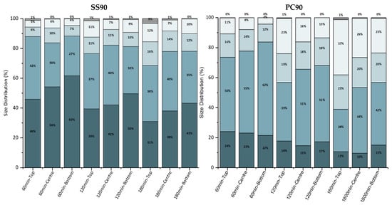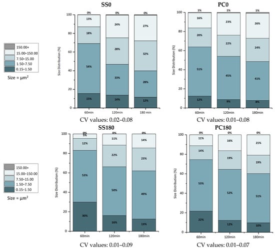 The results in Figure 7 illustrate the changes in the size distribution of the bacterial population attached to the surfaces over time. Since the surfaces were placed horizontally, the results are consolidated for the three control points. For SS material, surface orientation at 0° triggered the formation of bigger clusters compared to SS180, even after just 60 min of contact between the liquid medium and the surface. The same behavior, but to a lesser extent, was observed in the case of PC, where the surface coverage area was comparable in both PC0 and PC180 cases. In total, more clusters were observed on the PC surface than on the SS surface for all control points, confirming that PC material irreversibly attracts the bacterial cells. However, it is noteworthy that the rate that clusters are expanded from low to higher sizes seems higher for SS180 than SS0 or PC0 and comparable to that of PC180, i.e., clusters in the range of 15 to 150 μm2 increase (for the period 60 min to 180 min) from 12 to 23% (almost 92% increase) for SS180, from 18 to 32% (almost 78% increase) for SS0, from 14 to 19% (36% increase) for PC180, and from 20 to 24% (20% increase) for PC0.