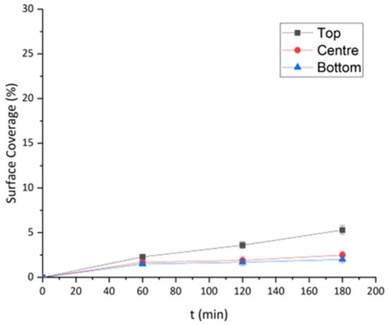 The results of bacterial attachment, expressed as a surface coverage percentage, for the SS material are presented in Figure 11, with respective images included in Figure 12. These images represent the central area of the coupon. The spatial and temporal evolution, as determined from the three control points over a 3 h period of the experiment, demonstrates significant differences (Figure 11). The top point, located closer to the free surface (2.10 cm), exhibits a more substantial increase in coverage rate over time than the centre and bottom points. The centre and bottom points are at greater distances from the free surface (6.10 and 10.30 cm, respectively) and exhibit slight differences. These differences in coverage percentages could result from the different distances of each point from the free surface, a characteristic parameter for each control point. This variation of this characteristic parameter is due to the placement of the substrate, as shown in Figure 1. Remarkably, the overall surface coverage was considerably lower in this case. For example, the highest surface coverage at the top area was around 5%, while for SS90, at the same spot, the coverage almost reached 10%. This behavior introduces another parameter that should be considered when designing such tests: the surface-over-volume ratio. For the SS45 test, the St/V ratio was significantly lower than for the other tests (Table 1), indicating that for the same surface, a much greater volume of nutrient medium is available. In other words, although the microbial count density remains the same, oxygen and nutrient availability become higher. Apparently, under these conditions, bacterial cells do not efficiently adhere to the surface; rather, the planktonic form or loose attachment is favorable.