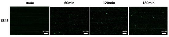 The results shown in Figure 5 present the ratio of surface area covered by biofilm when the wetted surface is placed horizontally (θ = 0° and 180°, Figure 1a,d). Figure 6 demonstrates representative images of biofilm obtained using fluorescence microscopy. It is apparent that gravity influences the biofilm formation onset. However, the underlying phenomena are rather complicated, as both the rate and degree of attachment are also dependent on the type of material in contact with the liquid medium. For bacterial attachment to a surface to be perpetual, the bacteria should first come into contact with the surface and subsequently attach to it, owing to the properties of the local micro-environment. The surface coverage was almost double in the case of PC compared to SS throughout all time periods. While gravitational orientation clearly influenced adhesion on SS, this effect was not evident on PC, indicating that material properties predominantly determined bacterial attachment on this surface. Nevertheless, the gravitational convection promotes the approximation of P. fluorescence to the surface, even though these bacteria exhibit self-generated movement due to various appendages on their surfaces, e.g., flagella and pili [37]. Surface coverage on SS0 was double that of SS180 at all times.
