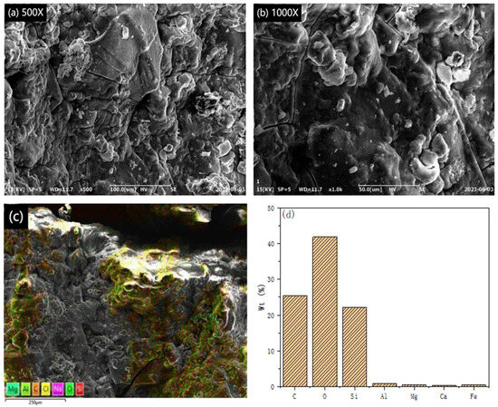 SEM images, EDS energy spectrum, and elemental distribution of PSAC at different magnifications: (a) 500×, (b) 1000×, (c) energy spectrum, and (d) proportion of elements.