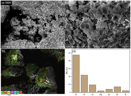 This study employed SEM to examine the morphological features of volcanic rock, silicon-containing PSAC, and silicon-free PSAC. The results are presented in Figure 1, Figure 2 and Figure 3. Figure 1a,b depict SEM micrographs of volcanic rock at magnifications of 500× and 1000×, respectively, revealing an uneven surface topography characterized by particles of varying sizes and surface impurities. This uneven structure enhances the contact area, facilitating complete acid soaking during the leaching process, which improves the efficiency of extracting valuable components from the volcanic rock and mitigates resource wastage due to incomplete leaching. Moreover, Figure 1c,d present the energy spectrum and elemental distribution maps of the volcanic rock, demonstrating the presence of carbon, oxygen, silicon, aluminum, and magnesium, with carbon, oxygen, and silicon being the most abundant. Notably, the aluminum content surpasses that of other metals, indicating the feasibility of utilizing volcanic rock for flocculant production.