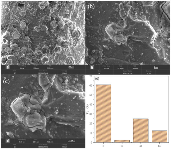 Figure 3 shows SEM images and elemental distribution graphs of desilicified PSAC. In contrast to the PSAC flocculant, Figure 3a,c show that desilicified PSAC has reduced surface roughness, with discernible cubic particles. These particles are likely remnants of aluminum silicate, which indicates incomplete silicon removal. As Figure 3d illustrates, desilication significantly reduces silicon content, with oxygen, aluminum, and iron becoming the primary constituents. This composition highlights the flocculant’s fundamental action mechanisms during flocculation processes.