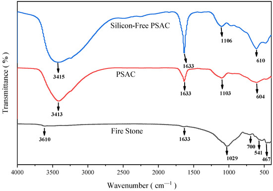 This study employed FTIR spectroscopy to investigate the phase structures of volcanic rock, silicon-containing PSAC, and silicon-free PSAC materials, as depicted in Figure 4. The FTIR spectrum of volcanic rock reveals characteristic peaks that provide insights into its chemical composition. The peak at 3610 cm−1 corresponds to the bending vibration of H-O-H [25], suggesting a lower concentration of crystalline and structural water. A prominent peak at 1029 cm−1 and another at 467 cm−1 further confirm the presence of Si-O-Al/Mg and Si-O plane vibrations [26,27,28]. In contrast, the FTIR spectra of the PSAC flocculant and silicon-free PSAC flocculant exhibit distinct features. The peaks at 3413 cm−1 and 3415 cm−1, respectively, correspond to the stretching vibration of -OH groups, indicating the formation of hydroxyl complexes during the hydrolysis of aluminum and iron ions in the flocculants [29]. The presence of a bending vibration peak at 1633 cm−1 for H-O-H [30] suggests the incorporation of water molecules as adsorbed water within the flocculants. This confirms the existence of hydroxyl complexes in PSAC, which contribute to its flocculation properties. Notably, the peak representing Si-O-Fe and Si-O-Al bonds shifts from 1029 cm−1 in volcanic rock to 1106 cm−1 in PSAC and 1103 cm−1 in silicon-free PSAC materials [31,32]. This shift indicates that the bonding between these elements undergoes fracture and recombination during the preparation process, leading to the formation of new tetrahedral structures. The structure included the Si in a high valence state, which has the possibility to enhance the flocculation by coupling Si, Al, and Fe. The emergence of this new peak validates the successful polymerization of the PSAC flocculant. Furthermore, absorption peaks at 604 cm−1 in the silicon-free PSAC materials suggest the superposition of Fe-O vibration peaks, Fe-OH characteristic absorption peaks, and Al-OH bending vibration peaks [33]. This indicates strong interactions between the hydroxyl complexes of aluminum and iron ions, which enhance the flocculation capacity of PSAC. Overall, the FTIR analysis provides valuable insights into the chemical transformations and structural changes that occur during the preparation of PSAC flocculants from volcanic rock.