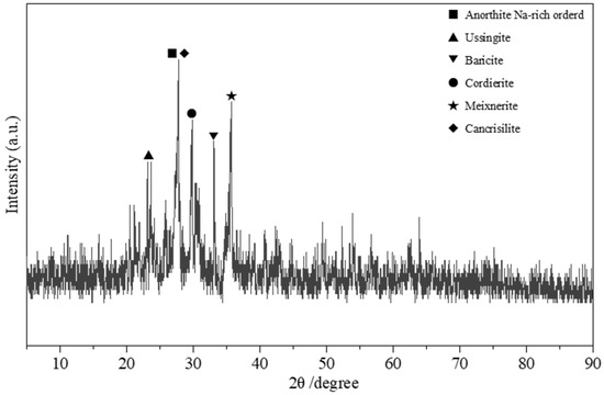 In this study, XRD was employed to characterize and analyze volcanic rock, silicon-containing PSAC, and silicon-free PSAC materials. The XRD patterns obtained were analyzed using Jade 6 software. By comparing the patterns with standard references, the overall chemical composition and molecular structure of the samples were determined, with the results shown in Figure 5, Figure 6 and Figure 7.