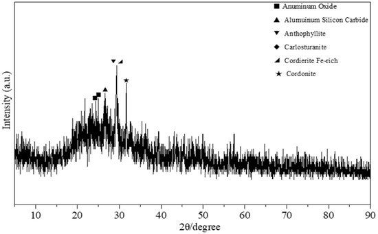 Figure 6 shows the XRD pattern of the PSAC flocculant material. The various elements present in the volcanic rock are mixed into the PSAC material, existing in different polymeric states within the PSAC, leading to a somewhat cluttered XRD pattern. To provide a more comprehensive understanding, it is noted that, as shown in Figure 6 (assuming it is a relevant reference for comparison, if not, this part can be adjusted or removed based on the actual context), the PSAC material also contains a variety of substances. Starting with the analysis of the XRD pattern in Figure 6, the characteristic peaks at diffraction angles of 2θ = 24.921° and 2θ = 25.463° are similar to the diffraction peaks in the standard pattern for alumina (PDF 31-0026). The characteristic diffraction peak at 2θ = 26.570° may represent silicon aluminum carbide (PDF 35-1073), with the chemical formula Al4Si2C5. The peak at 2θ = 26.356° may correspond to compounds contained in kyanite (PDF 45-1343), which includes elements such as magnesium, iron, silicon, and oxygen. The characteristic diffraction peak at 2θ = 29.355° is similar to the diffraction peaks in the standard pattern for ferroan amphibole (PDF 09-0472), a mineral rich in iron, aluminum, silicon, and magnesium. The peak at 2θ = 39.491° is similar to the diffraction peaks of Carlosturanite (PDF 38-0404), a mineral rich in magnesium, iron, and silicon. Regarding the characteristic diffraction peak at 2θ = 31.589°, it is similar to the diffraction peaks in the standard pattern for MgAl2(PO4)2(OH)2 (PDF 14-0313). The elements mentioned in these results are largely consistent with the findings of the EDS elemental analysis, indicating that the PSAC flocculant is primarily a composite product synthesized from elements such as aluminum, iron, magnesium, silicon, and oxygen. In addition, in comparison with the XRD pattern of the silicon-free PSAC flocculant in terms of peak intensity and sharpness (see Figure 7), the XRD pattern of PSAC displayed a fiber-bundle-like shape with broad peaks. This shape was regarded as a notable indicator of the presence of a greater number of polymeric compounds in the coagulants [34]. Furthermore, in the subsequent test, the proportion of polymeric species is significantly higher in silicon-containing PSAC than in silicon-free PSAC, a finding that is supported by the XRD results.