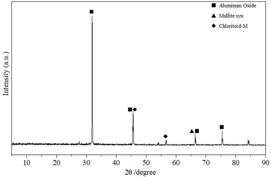 Figure 7 shows the XRD pattern of the porous PSAC without silicon. Notably, the XRD pattern appears less complex compared to that of the PSAC material containing silicon. The diffraction peaks observed at 2θ angles of 31.819°, 45.618°, 66.493°, and 75.372° align well with the standard pattern for alumina, as indicated by Powder Diffraction File (PDF) card number 47–1292. Furthermore, characteristic diffraction peaks are observed at 2θ angles of 66.488° and 45.691°, which correspond to the diffraction peaks in the standard pattern for chlorite (PDF 14-0062). Chlorite is a mineral abundant in iron-rich silicate–aluminate salts, with the primary component having the chemical formula FeAl2SiO5(OH)2. Additionally, the diffraction peak at 2θ = 66.514° might be associated with the diffraction peak in the standard pattern for mullite (Al6Si2O13, PDF 15-0776). Although most of the silicon was removed, a small quantity of residual silicon is still present in the material, as indicated by the XRD and EDS results.