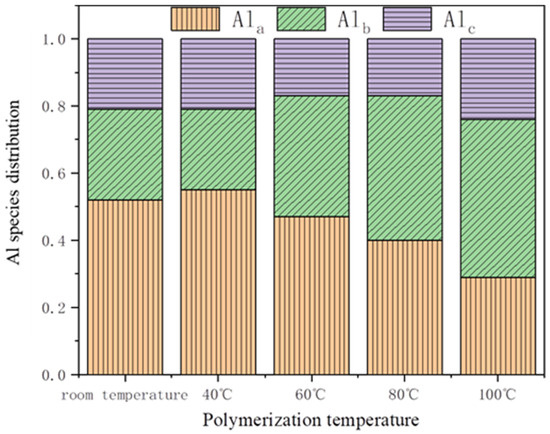 The study employed the Al–Ferron method to investigate the impact of polymerization temperature on the distribution and transformation of aluminum species in the flocculant. As shown in Figure 8, it was found that PSAC contained a higher proportion of Ala. The change in polymerization temperature had a significant influence on the distribution of aluminum species in PSAC. At ambient temperature, the proportions of Alc and Ala were 21% and 52%, respectively. As the polymerization temperature increased, the proportion of Alc remained relatively stable, whereas the proportion of Ala decreased and the proportion of Alb increased. When the polymerization temperature reached 100 °C, the proportions of Ala and Alc were relatively low (29% and 24%, respectively), while the proportion of Alb was relatively high, reaching 47%. This suggests that temperature changes significantly affected the proportions of Ala and Alb in PSAC. At lower polymerization temperatures, the majority of aluminum species in PSAC existed in the form of low-polymerization-state aluminum. However, as the polymerization temperature increased to 60 °C or higher, the distribution of aluminum species in the PSAC flocculant underwent notable changes. The proportion of Alb increased, while the proportion of Ala decreased. This is because the rise in temperature facilitated the transformation of Ala to Alb to some extent, thereby enhancing the flocculating performance of the PSAC.