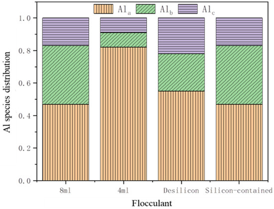 The study employed the Al–Ferron method to investigate the effects of alkali dosage and the presence of silicon on the distribution and transformation of aluminum species within the flocculant. The results, presented in Figure 9, clearly demonstrate that the amount of alkali significantly influences the form of aluminum in the PSAC flocculant. In PSAC, the majority of aluminum exists in the form of Ala, with only a minor portion of Al3+ combining with OH− in water to form complexes during hydrolysis. Specifically, PSAC treated with 4 mL of NaOH exhibits the highest proportion of Ala, reaching 82%, whereas PSAC treated with 8 mL of NaOH shows a notable increase in Alb, reaching 36%, and a slight increase in Alc, reaching 17%. This phenomenon can be attributed to the gradual increase in OH− concentration in the solution as the alkali dosage increases, leading to the continuous polymerization of free Al3+ and Ala with OH− to form Alb and Alc.