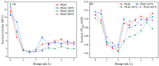 Figure 10a demonstrates the influence of varying calcination temperatures on turbidity removal from water. It was found that, under identical dosing conditions, changes in calcination temperature had minimal impact on the turbidity removal efficiency of the PSAC flocculant. Within a specific dosing range, the turbidity in the water decreased significantly as the flocculant dosage increased. The main reason for the decrease should be attributed to the over-dosing effect. Such a flocculation phenomenon was often observed in subsequent experiments. Optimal turbidity removal was achieved at a dosage of 1.5 mL/L, beyond which the residual turbidity in the water began to rise, indicating a pronounced instability phenomenon.