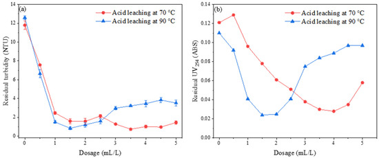 Figure 11a displays the influence of varying acid leaching temperatures on turbidity removal from water. The findings indicate that, within the dosing range of 0.5 to 2.5 mL/L, the PSAC flocculant prepared under the 90 °C acid leaching condition exhibited a slightly superior turbidity removal effect. However, as the dosing amount increased further, an evident instability phenomenon emerged. When the dosing amount surpassed 2.5 mL/L, the PSAC flocculant prepared under the 70 °C acid leaching condition began to outperform in terms of turbidity removal, demonstrating a stable flocculation effect with the residual turbidity in the water fluctuating within a certain range.