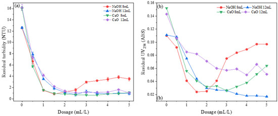 Figure 12a shows the influence of CaO- and NaOH-alkalized PSAC flocculants on the removal of turbidity from water. The results indicate that both 8 mL CaO-alkalized and 8 mL NaOH-alkalized PSAC flocculants achieved the best turbidity removal effect at a dosage of 1.5 mL/L. As the dosage increased, the turbidity removal effect of the 8 mL NaOH-alkalized PSAC flocculant initially increased and then decreased. The turbidity removal effects of the other three flocculants fluctuated within a certain range as the dosage increased. The residual turbidity remained within the range of 0.7–2 NTU.