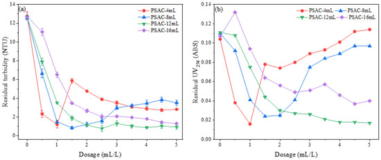Figure 13a shows the influence of PSAC flocculants prepared with different alkali dosages on the removal of turbidity from water. The results indicate that PSAC-4 initially achieved the best turbidity removal effect as the dosage increased. However, it quickly exhibited an instability phenomenon, with the turbidity removal effect starting to decrease and gradually stabilizing. This may be attributed to the incomplete alkali treatment of PSAC-4. Similarly, the turbidity removal effect of PSAC-8 also showed an instability phenomenon with increasing dosage, but the overall turbidity removal effect was relatively stable. PSAC-8 achieved the best turbidity removal effect at a dosage of 1.5 mL/L, with the residual turbidity controlled below 1 NTU. The turbidity removal effects of PSAC-12 and PSAC-16 showed a trend of initially increasing and then stabilizing, with the best turbidity removal effect achieved at a dosage of 5 mL/L.