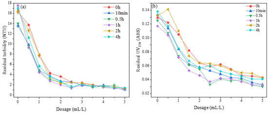 Figure 14a shows the effect of PSAC flocculants prepared with different polymerization times on the removal of turbidity from water. The results indicated that changes in polymerization time had little impact on the turbidity removal efficiency of the PSAC flocculant at a given dosage. As the dosage increased, the turbidity in the water decreased significantly. With the dosage over 3 mL/L, all PSAC flocculants prepared under the various polymerization times exhibited good turbidity removal effects, with the residual turbidity in the water primarily remaining within the range of 1–1.5 NTU.