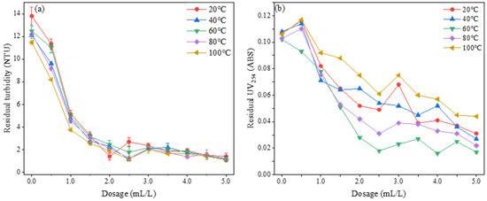 Figure 15a illustrates the influence of the PSAC flocculant prepared at different polymerization temperatures on the removal of turbidity from water. The results demonstrated that the PSAC prepared at 20 °C achieved the optimal turbidity removal effect at a dosage of 2 mL/L, reducing the residual turbidity in water to below 1 NTU. However, at a dosage of 2.5 mL/L, the turbidity removal performance of PSAC prepared at 20 °C exhibited instability. In contrast, PSAC prepared at 40 °C, 60 °C, 80 °C, and 100 °C demonstrated satisfactory turbidity removal effects. Notably, upon reaching a dosage of 3 mL/L, a slight rebound in residual turbidity was observed, which subsequently stabilized as the dosage increased further.