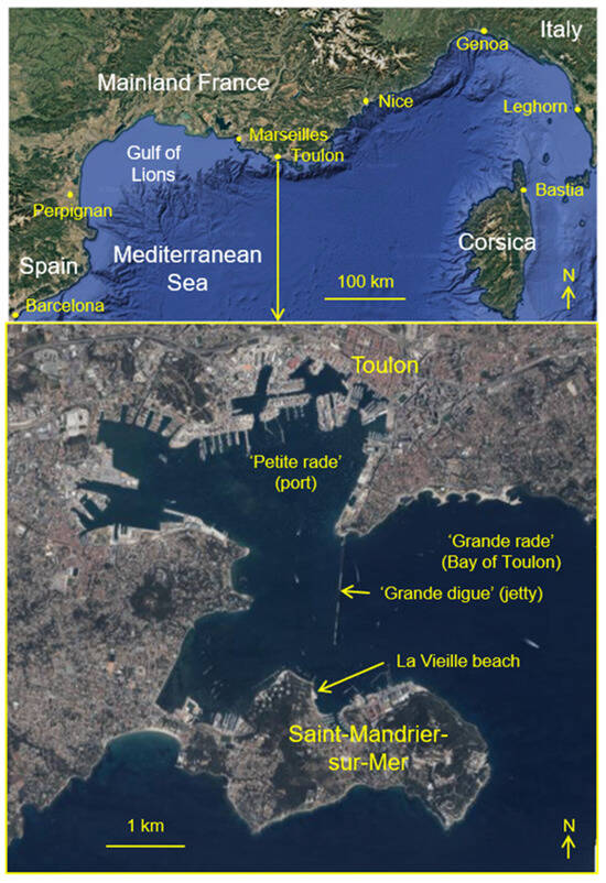 The Saint-Mandrier-sur-Mer (hereafter ‘Saint-Mandrier’) Peninsula is located south of the city of Toulon (Provence, France). It closes the Bay of Toulon to the south (Figure 1). Its coast formerly presented an alternation of cliffs and small pebble beaches. However, from the 20th century onwards, its coastline has been profoundly altered by humans. This transformation was linked first to the construction of extensive naval facilities, then to tourism development with the creation of marinas. In total, 22% of shallow coastal habitats between the sea level and 10 m depth have been artificialized [94]. The coastline of the peninsula located within the Petite Rade has been completely artificialized by port construction, land reclamations, riprap and artificial beaches such as that of La Vieille.