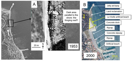 Comparison between aerial images from 1953 (A) and 2000 (B). The zoomed-in image (A) of the 1953 photograph shows a darker area parallel to the shore that can be interpreted as the fringing reef. The 2000 image (B) shows La Vieille beach demarcated by a yellow dotted line. From IGN.