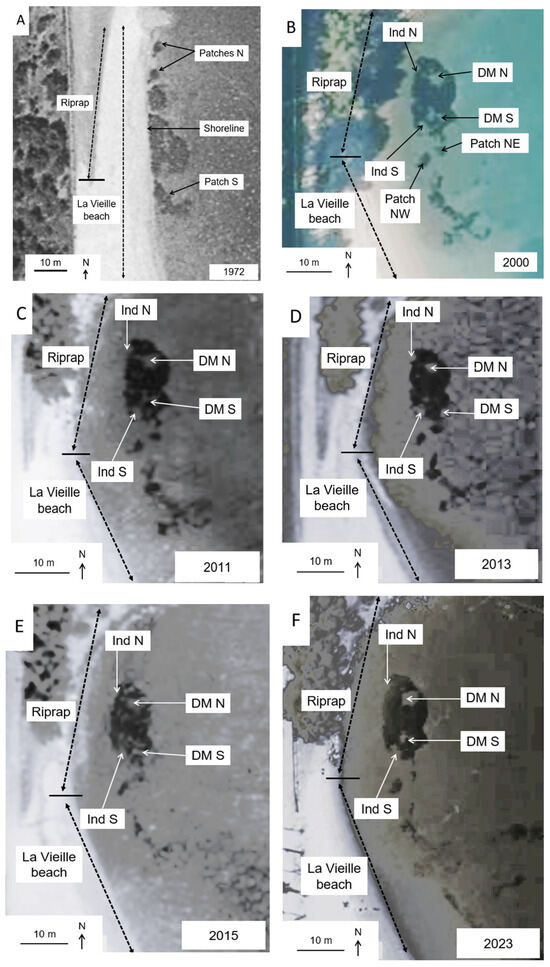Maps of the fringing reef of La Vieille beach, from aerial photographs: 1972 through 2023 (A–F). Dotted arrows indicate the extent of the ripraps and the beach, and the black line marks their limit. Ind N: Indentation North; Ind S: Indentation South; DM N: patch of dead matte North; DM S: patch of dead matte South. The pictogram (sea, sun and arrow), at the bottom right of F, indicates the direction of the sun’s rays, deduced from the shadows on the beach.