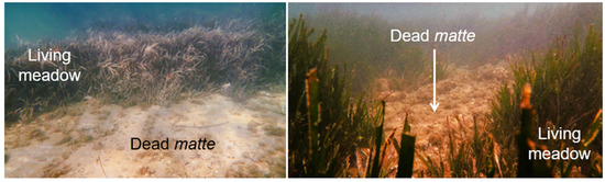 An original feature of P. oceanica meadows is that the rhizomes are not easily degradable and are therefore preserved for millennia [27]. The structure constituted by the dead and living rhizomes, and by the sediment which fills the interstices, is called ‘matte’. Over time, the living part of the matte, with living shoots, rises towards the sea surface; in shallow and sheltered bays, the meadow can reach the sea surface, with leaf tips slightly emerging, first forming fringing reefs, then barrier reefs where a lagoon occurs between the shore and the reef [6,17,28,29].